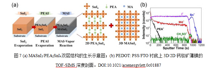 日本檀國(guó)大學(xué)Won-Gyu Choi等采用了一種非傳統(tǒng)的3D/2D異質(zhì)結(jié)雙層鈣鈦礦結(jié)構(gòu)制備方法。通過(guò)PEAI蒸氣處理真空沉積的SnI2,在3D鈣鈦礦表面形成2D PEA2SnI4層,接著利用MAI蒸氣在薄膜中形成3D MASnI3結(jié)構(gòu),有效地縮短了材料暴露在外界環(huán)境中的時(shí)間,從而減少了SnI2和MASnI3氧化的風(fēng)險(xiǎn),然后通過(guò)飛行時(shí)間二次離子質(zhì)譜 (TOF-SIMS) 測(cè)試驗(yàn)證了這種3D/2D雙層異質(zhì)結(jié)的存在。