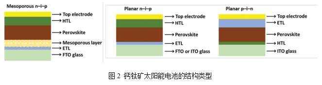 一般來說,PSCs呈現(xiàn)類似“三明治”結(jié)構(gòu),主要由透明導電電極(ITO和FTO等,其中FTO更能承受高溫)、電子傳輸層(ETL)、鈣鈦礦層、空穴傳輸層(HTL)和金屬電極(金、銀、銅等)組成。根據(jù)ETL的形態(tài),可以將PSCs分為介孔結(jié)構(gòu)和平面結(jié)構(gòu)。另外,根據(jù)ETL和HTL的位置分布,又可以將平面PSCs分為正式結(jié)構(gòu)(n-i-p,ETL-鈣鈦礦層-HTL)和反式結(jié)構(gòu)(p-i-n,HTL-鈣鈦礦層-ETL)。